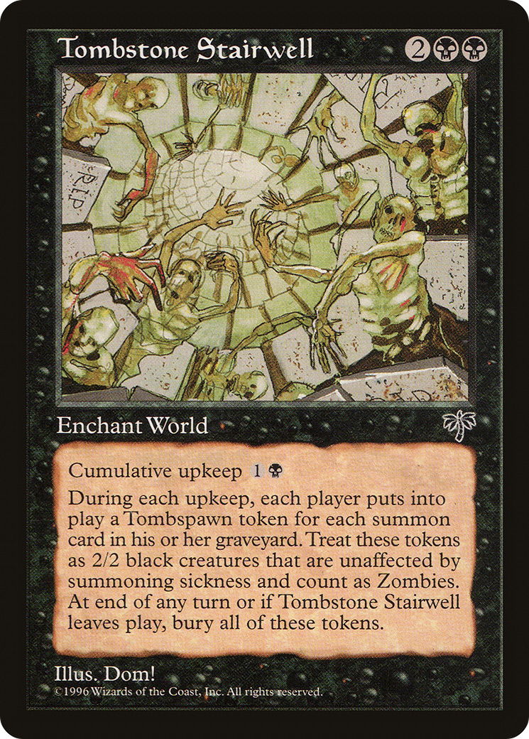 At the beginning of each upkeep, if Tombstone Stairwell is on the battlefield, each player creates a 2/2 black Zombie creature token with haste named Tombspawn for each creature card in their graveyard.