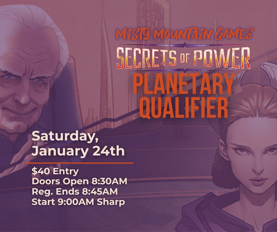MMG is proud to be hosting a Secrets of Power Planetary Qualifier! This will be a one day competition with 128 maximum participants! In addition to the prizing provided by FFG, each person in the Top 8 will receive a box of Secrets of Power Carbonite Boosters!