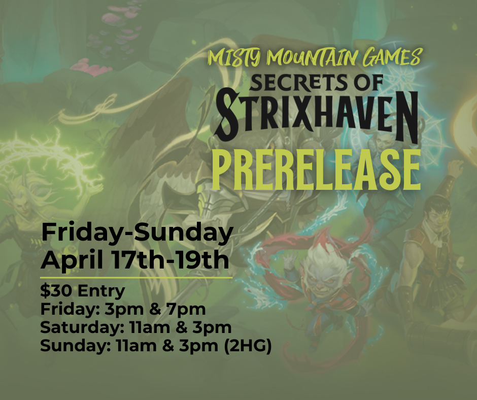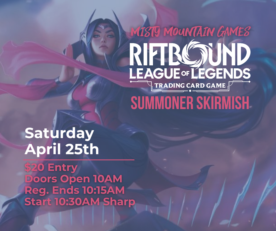 Come on down to our Summoner Skirmish in April for Spiritforged. We will play a set of rounds determined by the amount of players we have. There will be a cut to top 8 to play for a playmat and promos!
