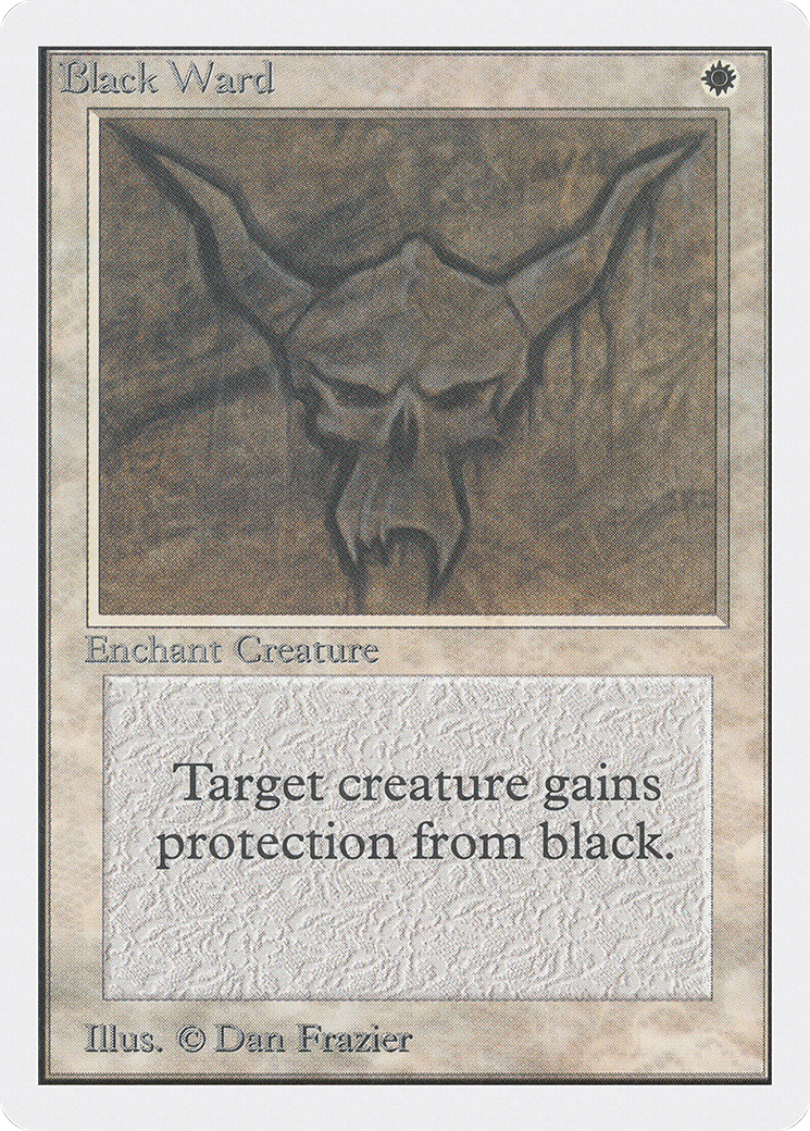 Enchanted creature has protection from black. This effect doesn't remove Black Ward.