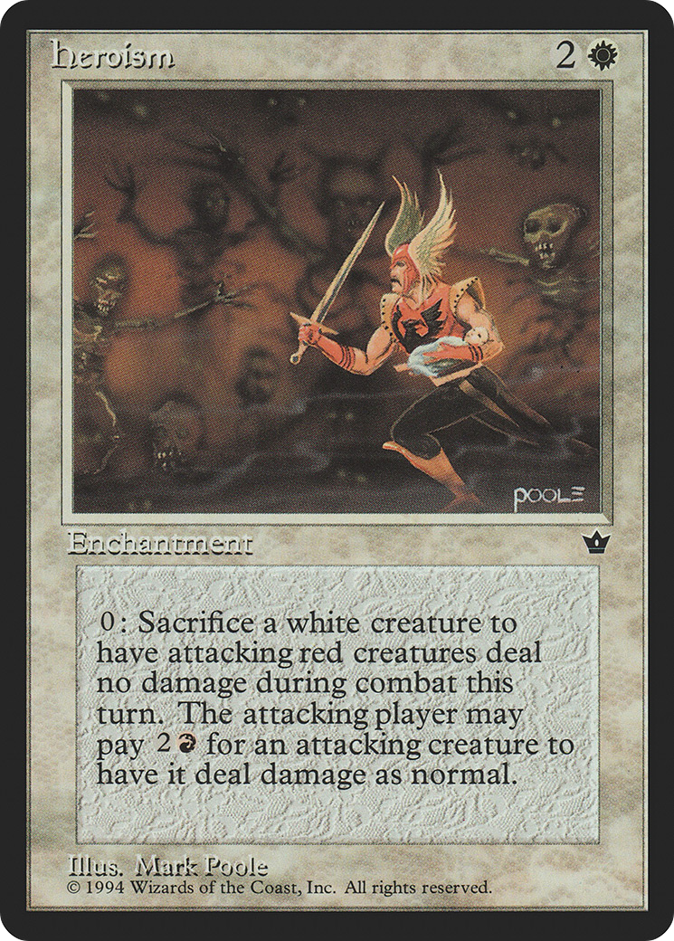 Sacrifice a white creature: For each attacking red creature, prevent all combat damage that would be dealt by that creature this turn unless its controller pays {2}{R}.