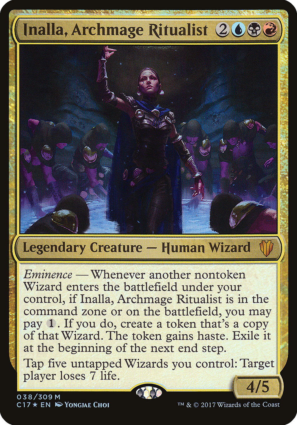 Eminence — Whenever another nontoken Wizard enters the battlefield under your control, if Inalla, Archmage Ritualist is in the command zone or on the battlefield, you may pay {1}. If you do, create a token that's a copy of that Wizard. The token gains haste. Exile it at the beginning of the next end step.