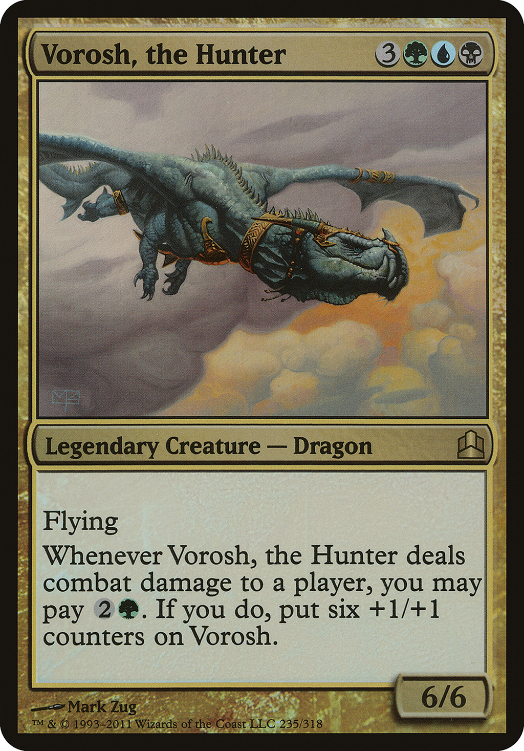 Whenever Vorosh, the Hunter deals combat damage to a player, you may pay {2}{G}. If you do, put six +1/+1 counters on Vorosh.