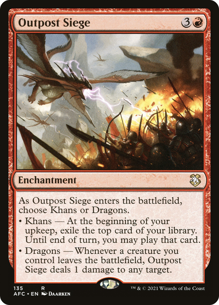 • Dragons — Whenever a creature you control leaves the battlefield, Outpost Siege deals 1 damage to any target.