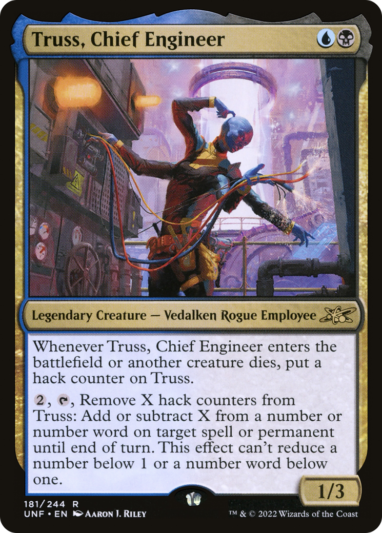 Whenever Truss, Chief Engineer enters the battlefield or another creature dies, put a hack counter on Truss.